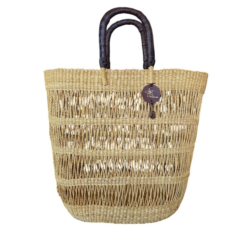 This Bolga Cosmo Mesh Basket is artisan hand woven from sundried elephant grass in Ghana.  A unique bag for your daily requirements, it has deep sides constructed with mesh weave and a double handle for easy access.  It is perfect for the market or beach.