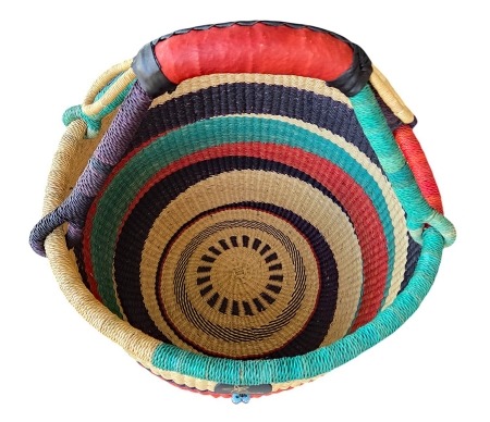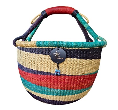 Bolga Market Basket – hand woven in Ghana, this large, high quality basket has a fixed single handle for carrying comfort and an open top for accessibility. Great for market shopping, beach and BBQ.