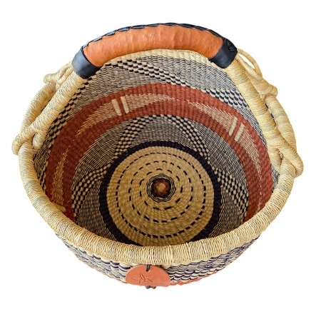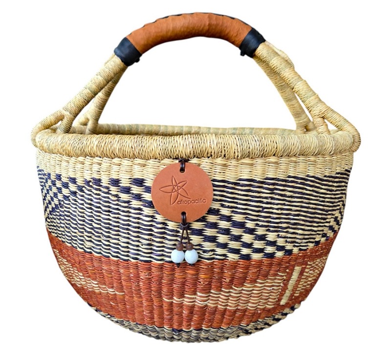 Round Market Basket – hand woven in Ghana, this high quality basket has a fixed single handle for carrying comfort and an open top for accessibility. Great for market shopping, beach and BBQ.