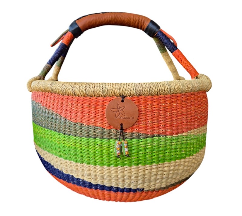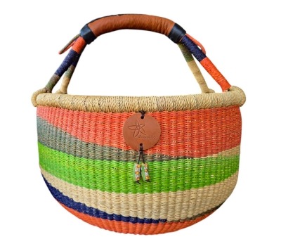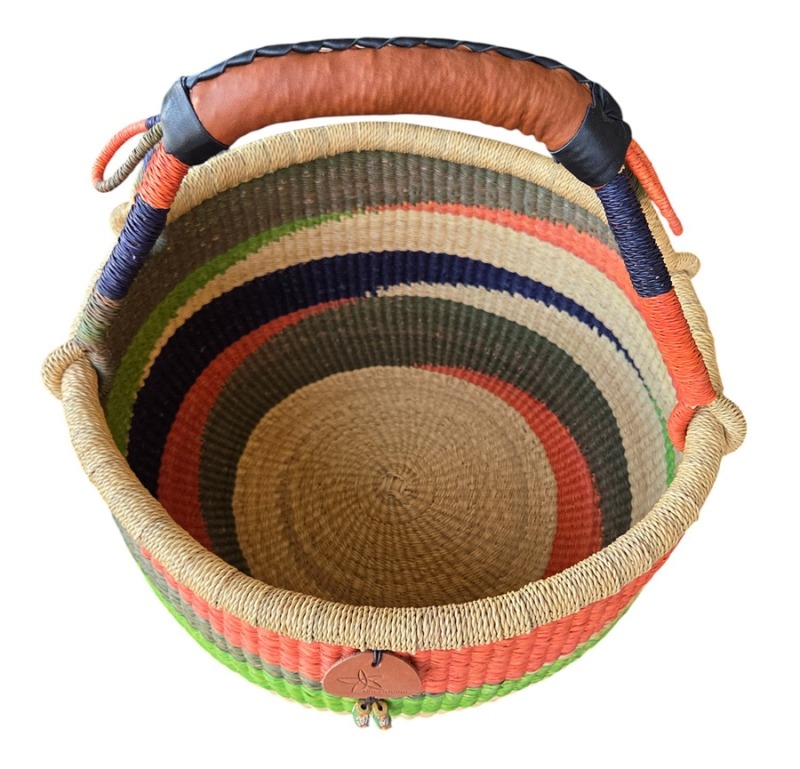 Round Market Basket – hand woven in Ghana, this large, high quality basket has a fixed single handle for carrying comfort and an open top for accessibility. Great for market shopping, beach and BBQ.