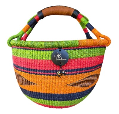 Bolga Market Basket – hand woven in Ghana, this large, high quality basket has a fixed single handle for carrying comfort and an open top for accessibility. Great for market shopping, beach and BBQ.