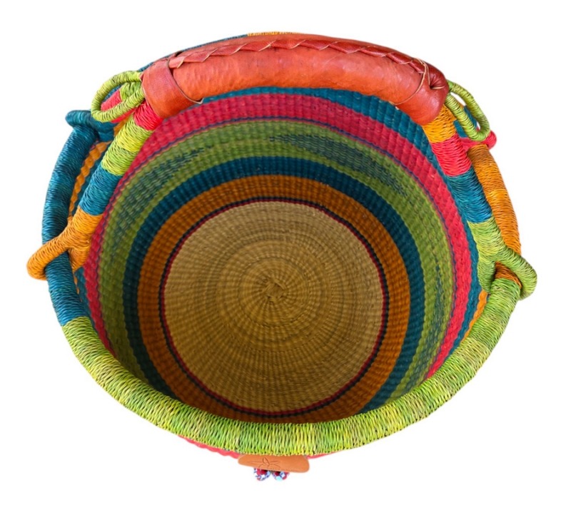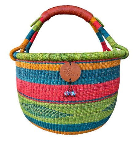 Bolga Market Basket – hand woven in Ghana, this large, high quality basket has a fixed single handle for carrying comfort and an open top for accessibility. Great for market shopping, beach and BBQ.