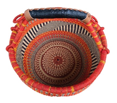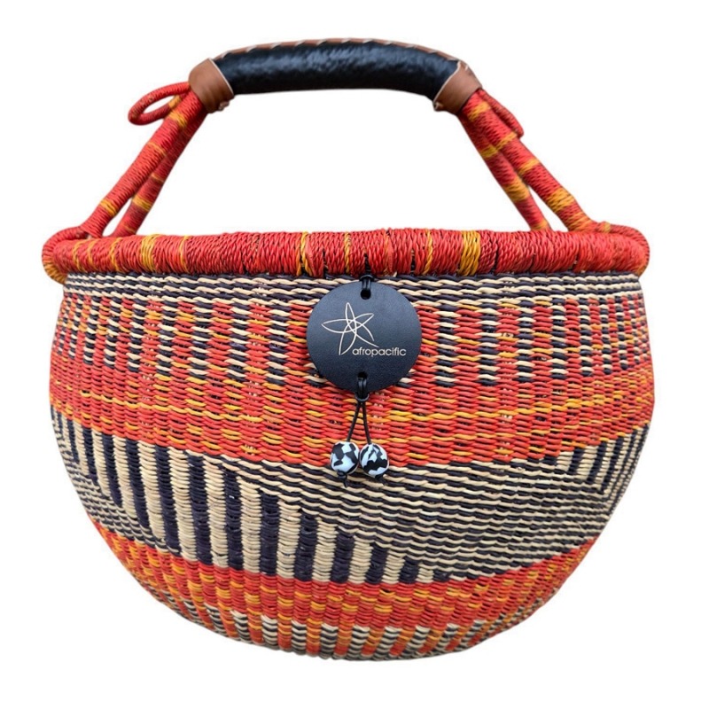 Bolga Market Basket – hand woven in Ghana, this large, high-quality basket has a fixed single handle for carrying comfort and an open top for accessibility. Great for market shopping, beach and BBQ.