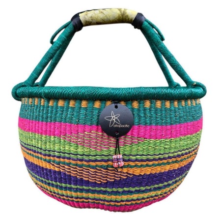 Bolga Market Basket – hand woven in Ghana, this large, high-quality basket has a fixed single handle for carrying comfort and an open top for accessibility. Great for market shopping, beach and BBQ.