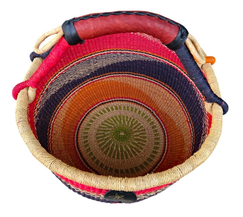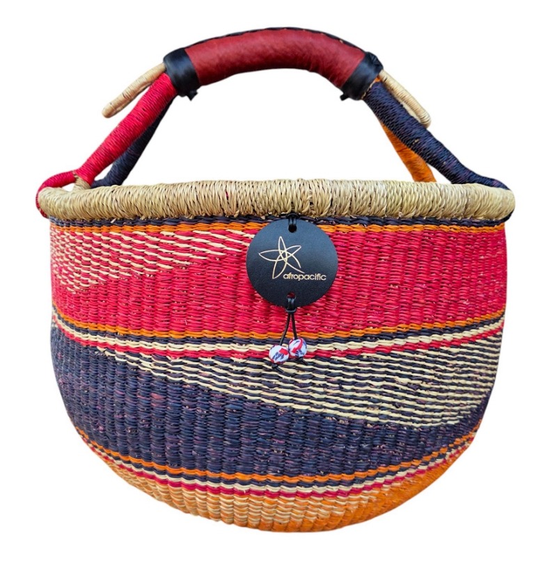 Round Bolga Market Basket – hand woven in Ghana, this large, high-quality basket has a fixed single handle for carrying comfort and an open top for accessibility. Great for market shopping, beach and BBQ.