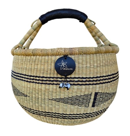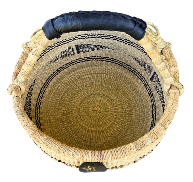 Round Market Basket – hand woven in Ghana, this large high quality basket has a fixed single handle for carrying comfort and an open top for accessibility. Great for market shopping, beach and BBQ.