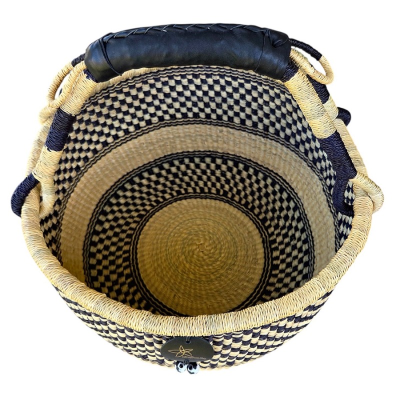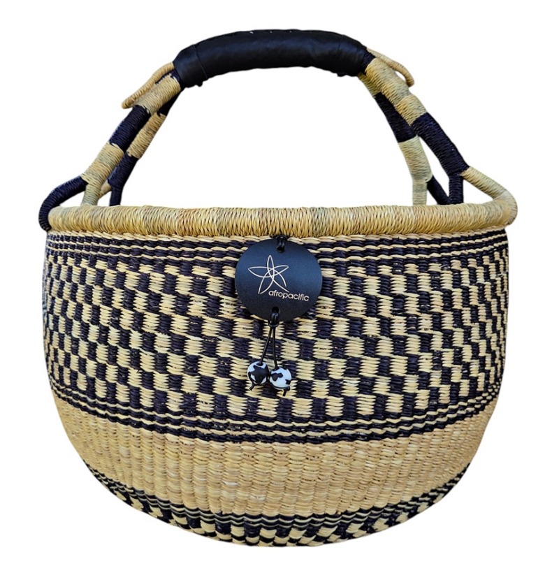 Round Market Basket – hand woven in Ghana, this high quality basket has a fixed single handle for carrying comfort and an open top for accessibility. Great for market shopping, beach and BBQ.