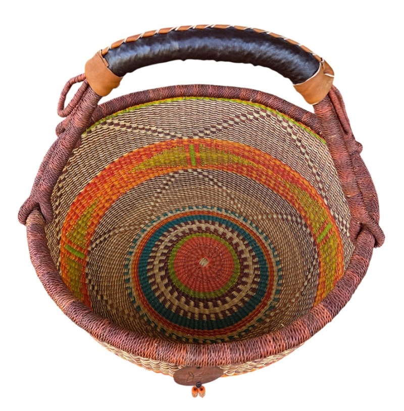 Round Bolga Market Basket – hand woven in Ghana, this large, high-quality basket has a fixed single handle for carrying comfort and an open top for accessibility. Great for market shopping, beach and BBQ.