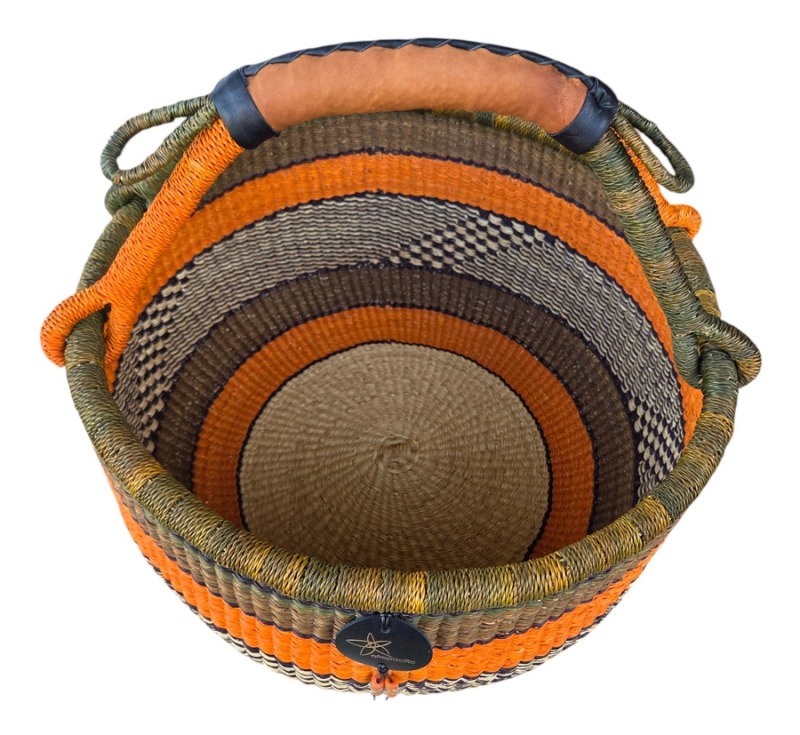 Round Bolga Market Basket – hand woven in Ghana, this large, high-quality basket has a fixed single handle for carrying comfort and an open top for accessibility. Great for market shopping, beach and BBQ.