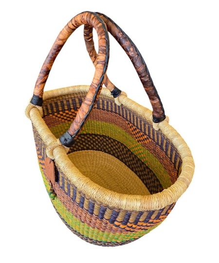 Beautifully hand woven in Ghana, this Bolga Oval Shopper Basket has a double handle and sturdy rimmed edge which makes it strong, open and accessible. Great beach/swimming basket for the family, or for your market shopping.